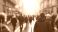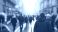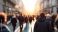• Crowd of people walking toward bright sunlight in a city street, representing urban lifestyle, movement and direction.