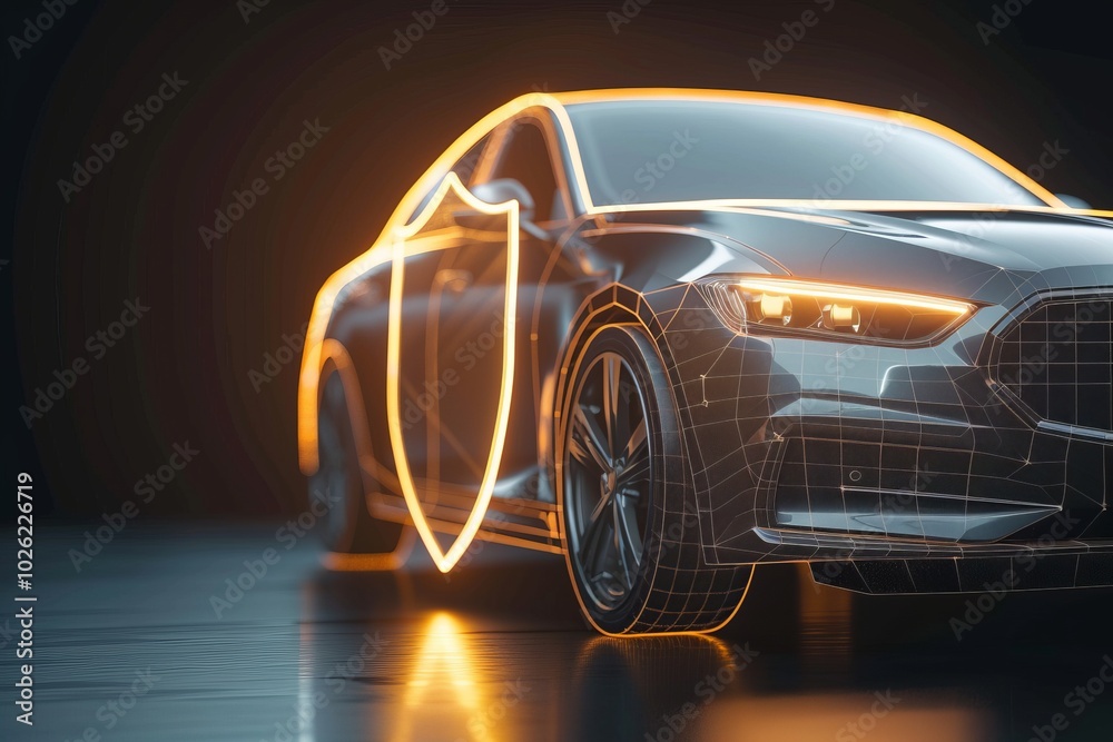 • Futuristic car with a shield symbol representing security and protection and car insurance