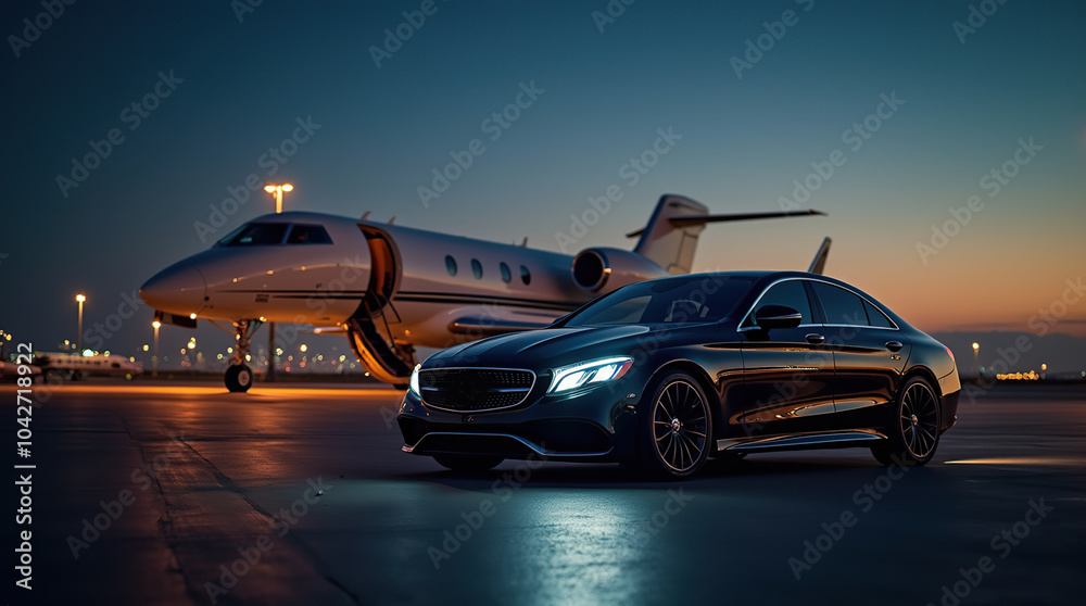 Auta - Luxury airport transfer with sleek car and private jet at sunset #1042718922