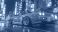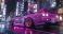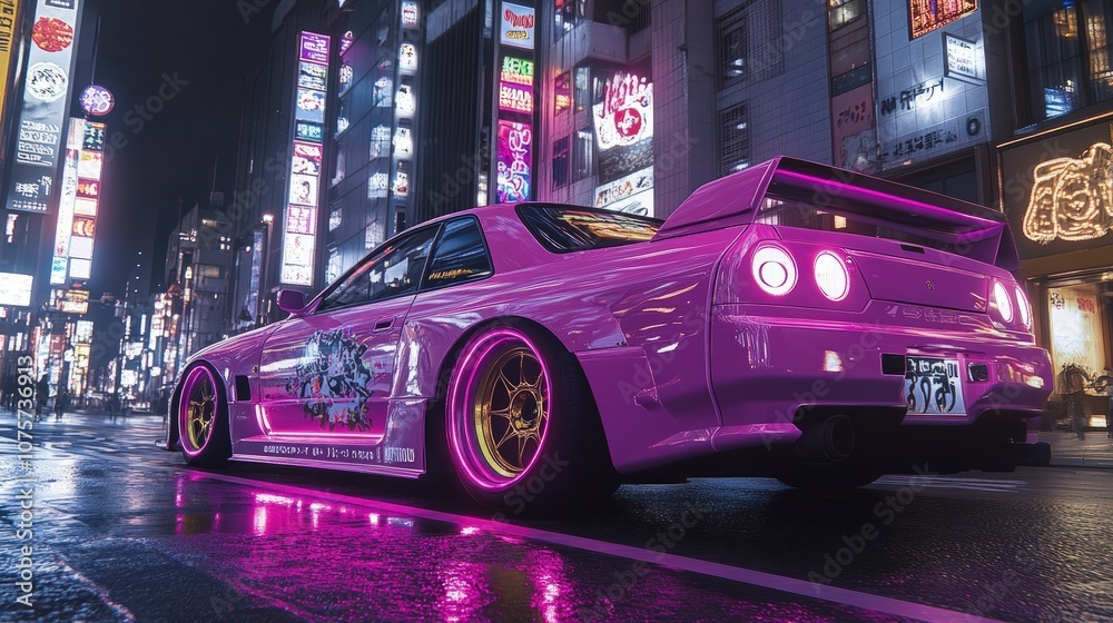 Auta - Pink sports car with neon lights driving through a city at night. #1075736913