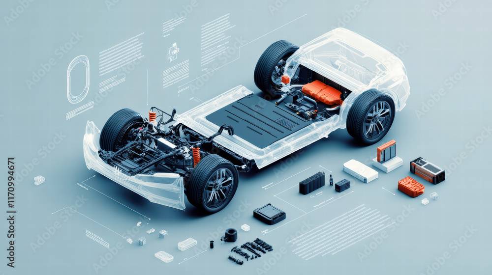 Auta - 3D electric car assembly steps with detailed components and layout, showcasing battery, chassis,... #1170994671