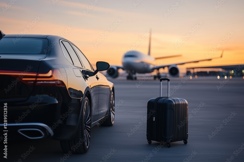 • Black luxury car parked near a rolling suitcase on the airport tarmac with an approaching airplane at sunset. Elegant travel and transportation concept.
