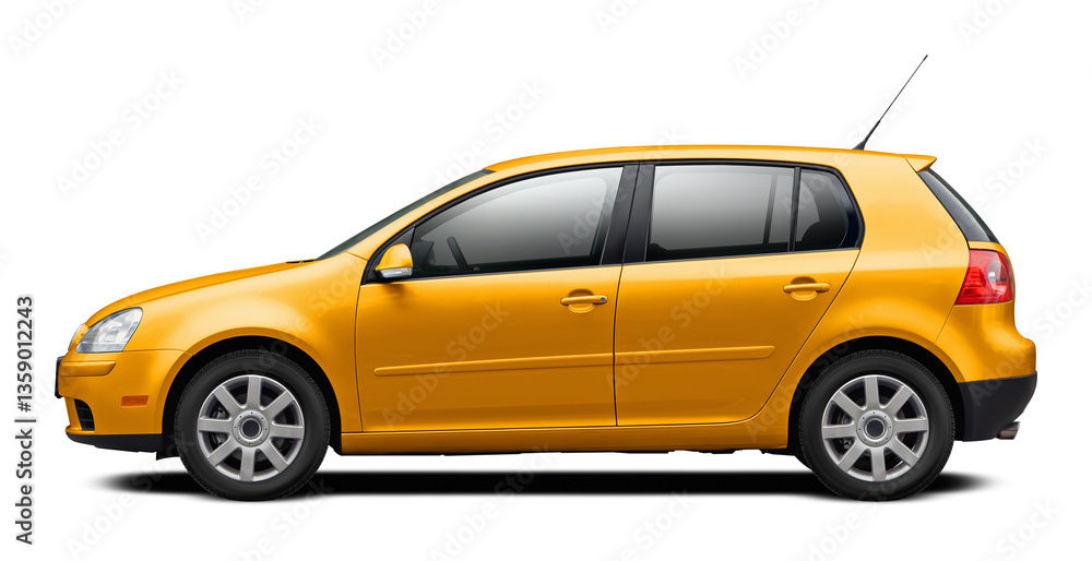 • Modern European car with a side view, hatchback body, all yellow. In png format on a transparent background.