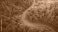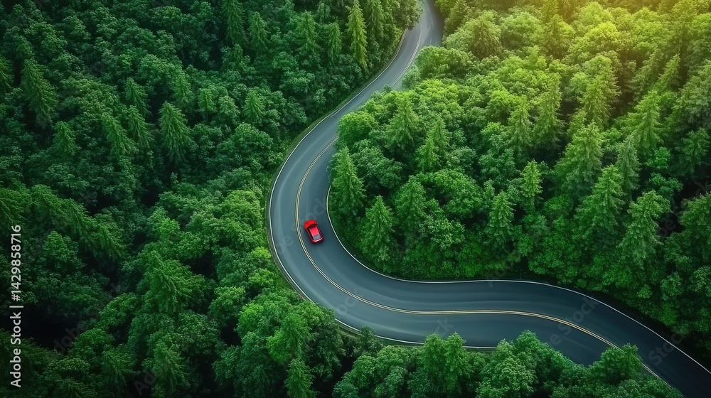 • A vibrant red car driving along a scenic winding road surrounded by a dense, lush green forest. Sunlight filters through the tall trees, casting soft shadows on the road. A dynamic and adventurous