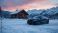 • At sunset, a dark blue car is parked close to a cozy wooden cabin in the snowy mountains. By Tuty