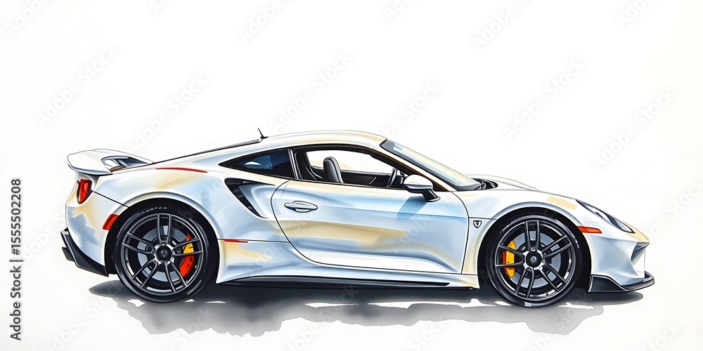 • A highly detailed, realistic side-view illustration of a white sports car with colorful accents and a large rear spoiler.