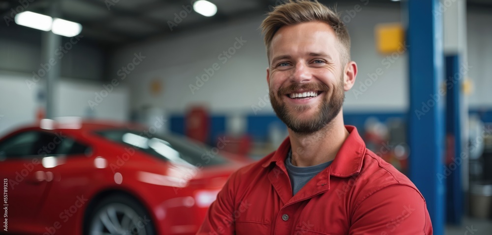 • Smiling mechanic near red car. Happy man at auto repair shop. Auto service specialist with automobile garage background. Automotive industry worker offers pro vehicle maintenance.