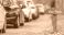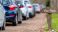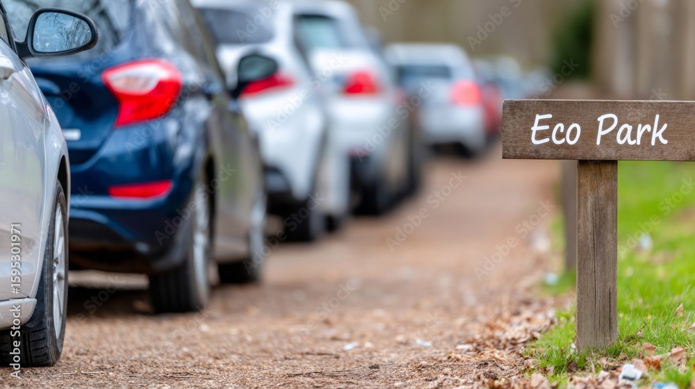 • Eco Park sign close-up with a long line of idling cars stretching into the forest, traffic jam in nature reserve, symbol of over-tourism and environmental strain