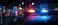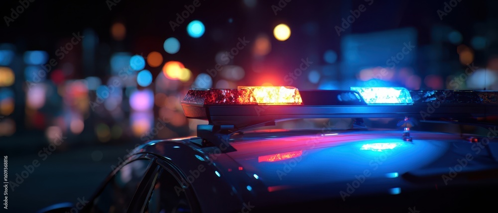 • The police car with flashing lights illuminated in a vibrant city nightlife scene.