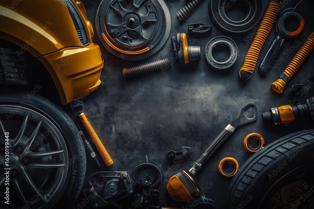Auta - Various car spare parts on a mechanic workbench background in a garage, auto repair shop or auto... #1630199448