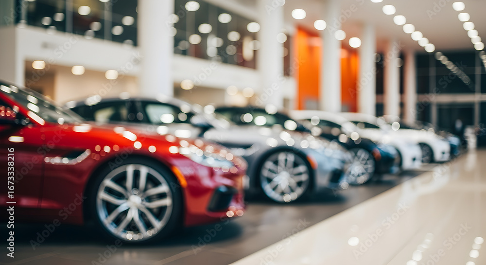 Auta - Blurred Rows of Cars in Bright Indoor Showroom with Tile Floors Featuring Red Silver Black and... #1673338216