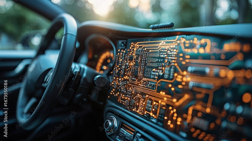 • "Futuristic Car Dashboard with Digital Circuit Board Interface"