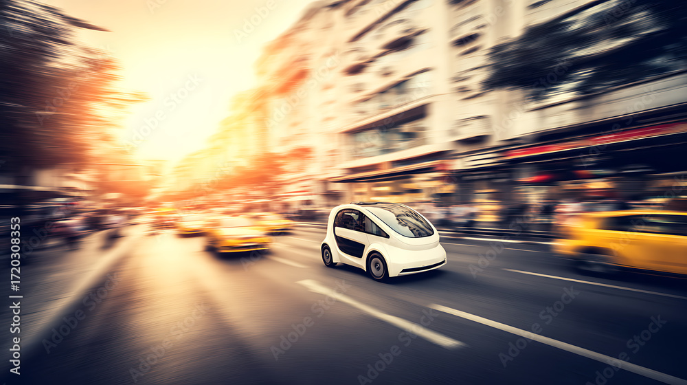 • A futuristic compact car drives through a bustling city street at sunset, surrounded by motion-blurred vehicles and urban architecture.