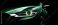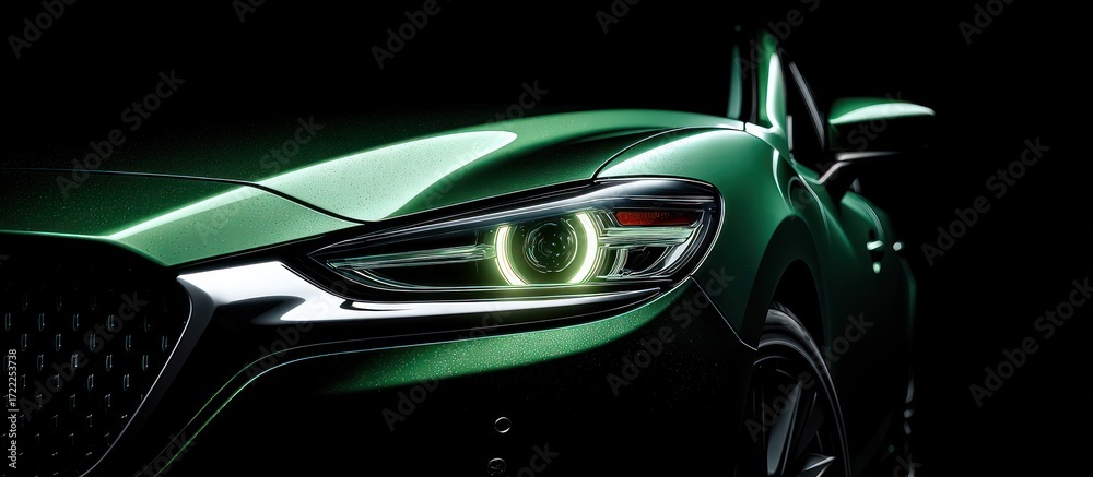 • Gleaming green car detail headlight and grille against a dark background