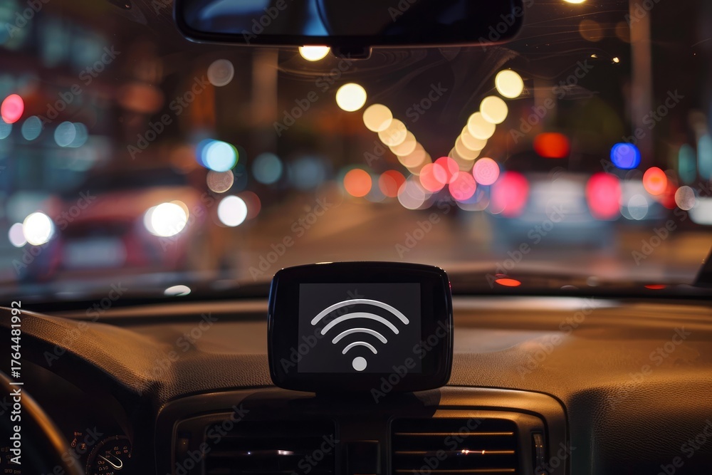 Auta - Gps device displaying wifi signal mounted on car dashboard with blurred city lights in background... #1764481992