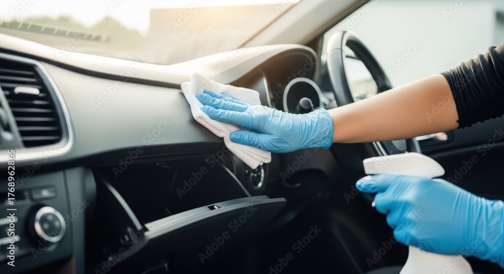 Auta - Female cleaning car interior with blue gloves and spray bottle for professional auto detailing #1768962865