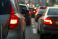 • A traffic jam with blurred lights of the cars ahead. Evening rush hour with a line of cars, waiting for their turn to move. City life with busy traffic and red taillights.