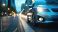 A futuristic compact car drives through a bustling city street at sunset, surrounded by motion-blurred vehicles and urban architecture.