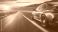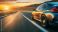 A futuristic compact car drives through a bustling city street at sunset, surrounded by motion-blurred vehicles and urban architecture.