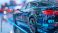 • A high-tech car adorned with vibrant digital patterns symbolizes advanced automotive technology and AI integration in a modern setting