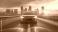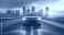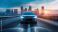 • Dynamic front view shot of a car on a highway, cinematic style, with a modern cityscape in the background