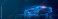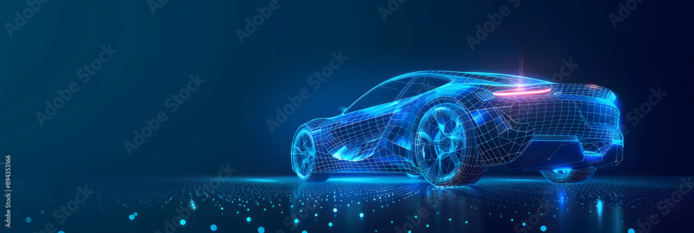 • Futuristic digital wireframe of car concept with blue background.