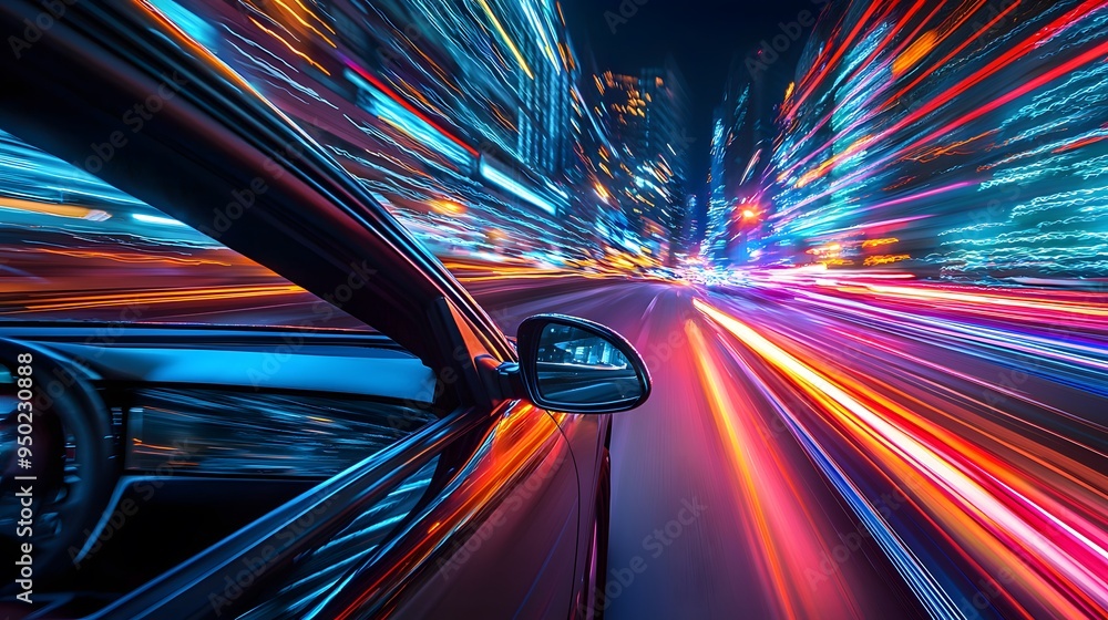 Auta - Dynamic night scene of a fast-moving car with city lights blurred in motion. #950230888