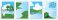 • Abstract Green Summer landscape background vector set. Nature wallpaper of green field on mountain, yellow flowers, blue sky , birds, river. Watercolor illustration for cover, wall art, decoration.