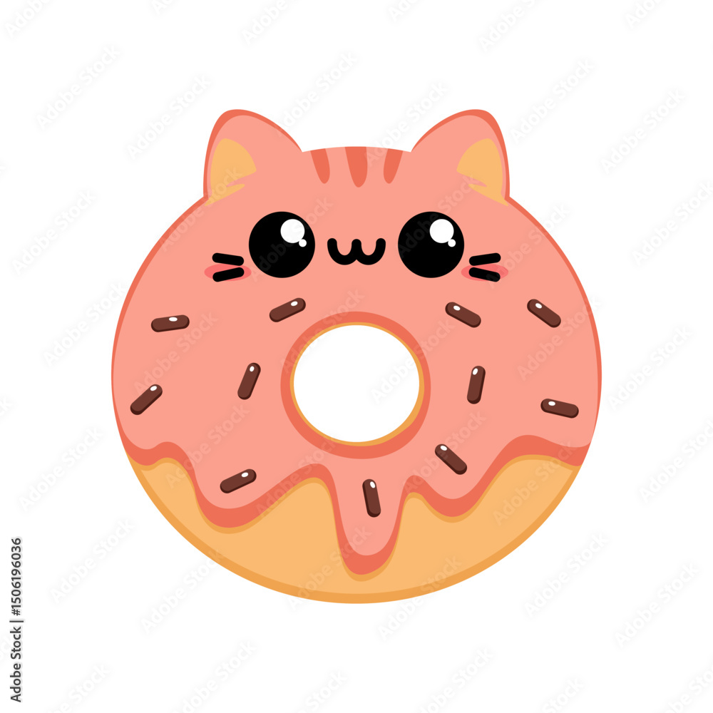 • Słodki kawaii pączek w kształcie kota z różową polewą - urocza ilustracja wektorowa.