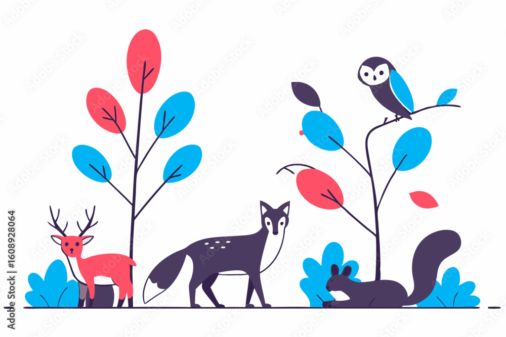 Bajki - Zwierzęta leśne. Minimalistyczna scena z jeleniem, lisem, sową i wiewiórką, idealna jako element... #1608928064