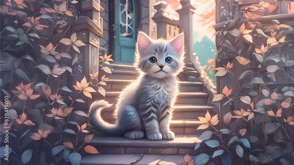 Bajki - Mały kot, kotek siedzi na schodach przed wejściem do domu #828419010