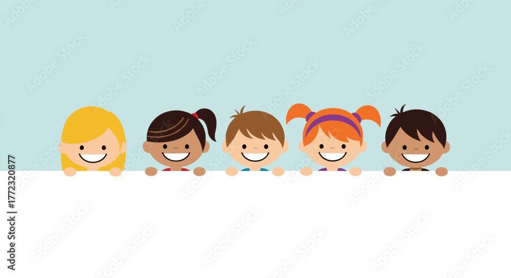 • A happy group of diverse cartoon children with cheerful expressions peeking over a blank white banner, ready for your message.