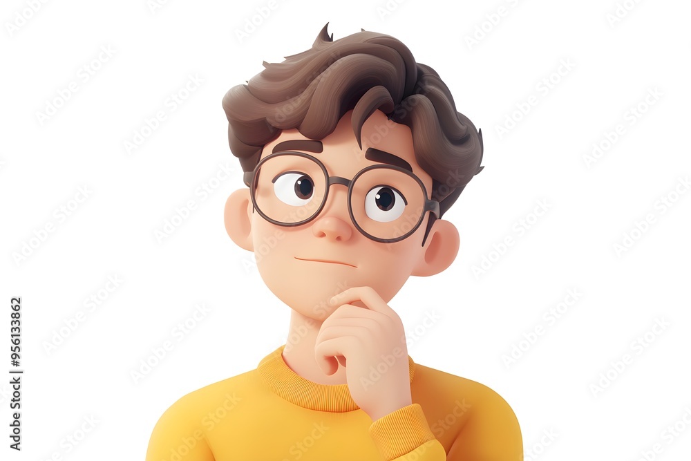 • 3D illustration of a young cartoon character with glasses, wearing a yellow sweater, pondering thoughtfully. The image conveys curiosity, contemplation, and creative thinking.