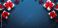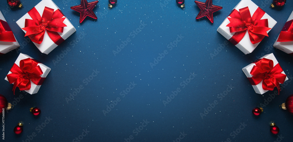 • Merry Christmas and Happy Holidays greeting card, frame, banner. New Year. Noel. Red and white Christmas decorations and gifts on blue background top view. Winter xmas holiday celebration theme.
