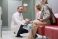 Caucasian male doctor kneeling and speaking with Caucasian girl child while senior Caucasian woman sitting nearby in waiting area, doctor holding clipboard and pen, medical consultation scene