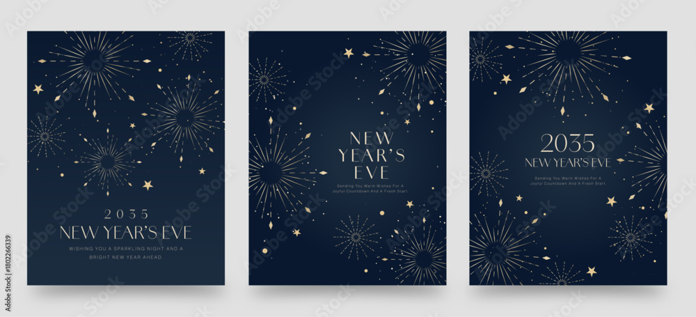 • Luxury Happy New Year NYE Flyer Poster Banner Layout Vector with Gold Fireworks on Navy Blue Background for Elegant New Year’s Eve Celebration
