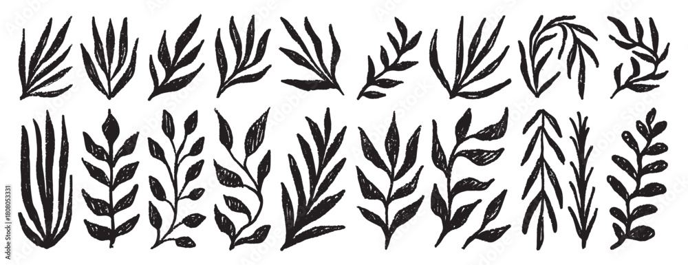 Krajobraz wiejski - Plant silhouette leaves textured set. Leaves crayon hand drawn foliage simple collection. Trendy... #1808053331