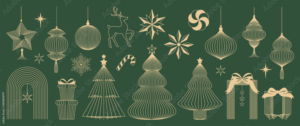 • Christmas and Happy New Year vector mid century line art illustration set with festive elements in forest green and gold tones — elegant design for greeting cards