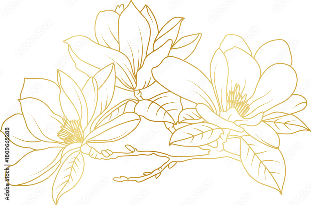 • Golden magnolia flowers line art isolated on white background. Luxury magnolia floral design elements for invitation, wedding, wallpaper, print template, vector illustration