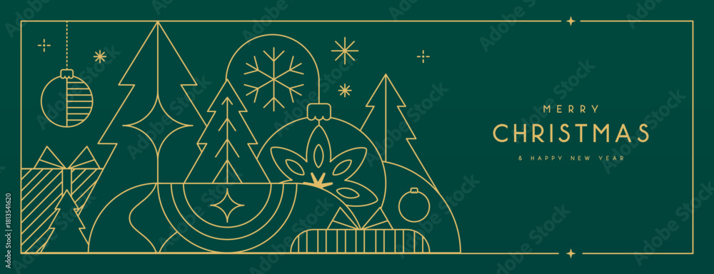• Line art Christmas holiday greeting card on emerald green background. Vector illustration