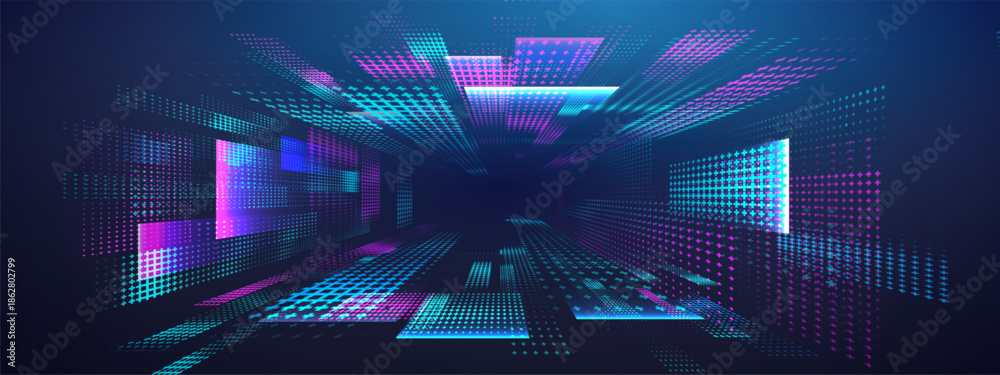 Quantum tunnel with LED wireframe and wormhole for cyber background. Speed art and vector for concept design. Digital grid and tech for virtual event art.