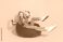 Young girl in jeans on a blue beanbag smiles excitedly in bright yellow studio background