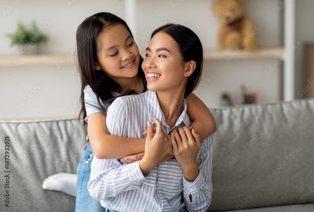 • Happy asian little girl hugging her beautiful mother and smiling to each other, sitting on sofa in living room, copy space. Adorable family young woman and her daughter embracing
