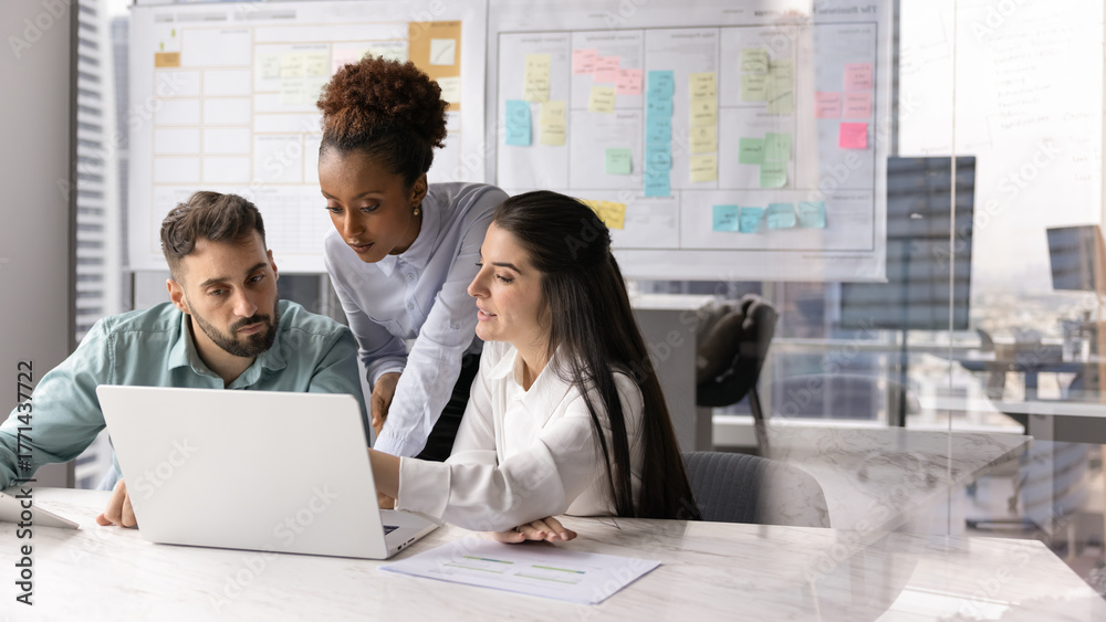 Miasto - International business team developing project on notebook in Agile office #1771437722