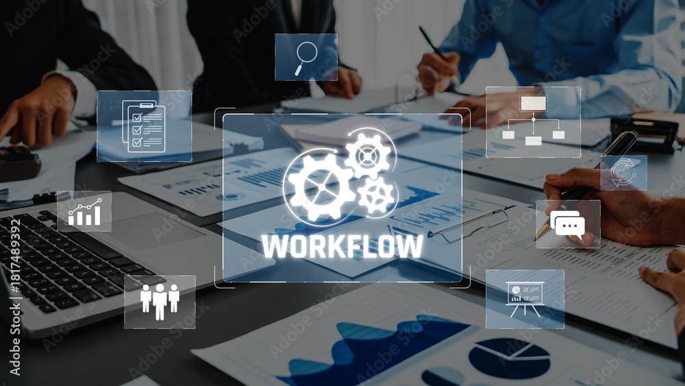 Miasto - A dynamic office setting depicts teamwork and workflow through charts and digital icons,... #1817489392