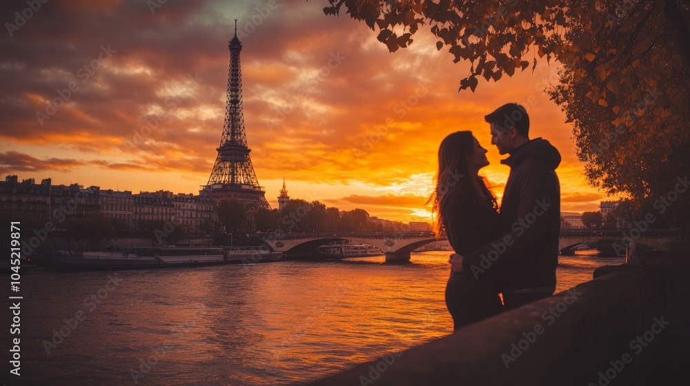 • Romantic sunset by the Eiffel Tower with a couple in love in Paris, kissing by the river. A beautiful moment captured in time.