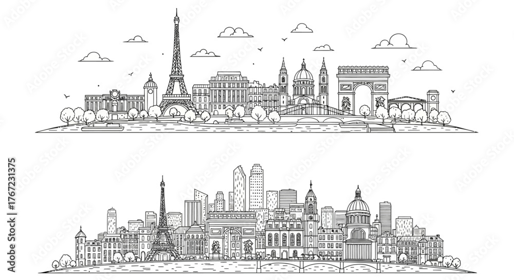 • Paris City Skyline Line Art Vector Set - Eiffel Tower Landmark Illustration