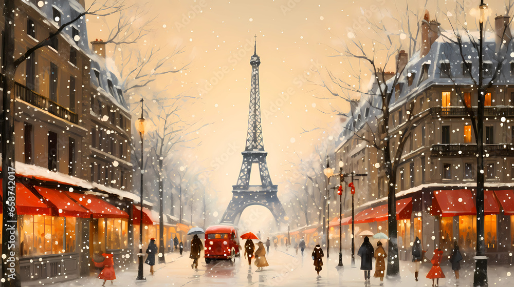 Paryż - Illustration of the city of Paris at Christmas, France #658742017