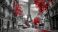 • Street-level view of Paris showcases the Eiffel Tower in black and white with a splash of red, adding to its allure.