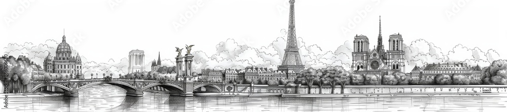 • Black and white sketch of Paris city skyline featuring landmarks like the Eiffel Tower, Notre-Dame Cathedral, and bridges over the Seine river.